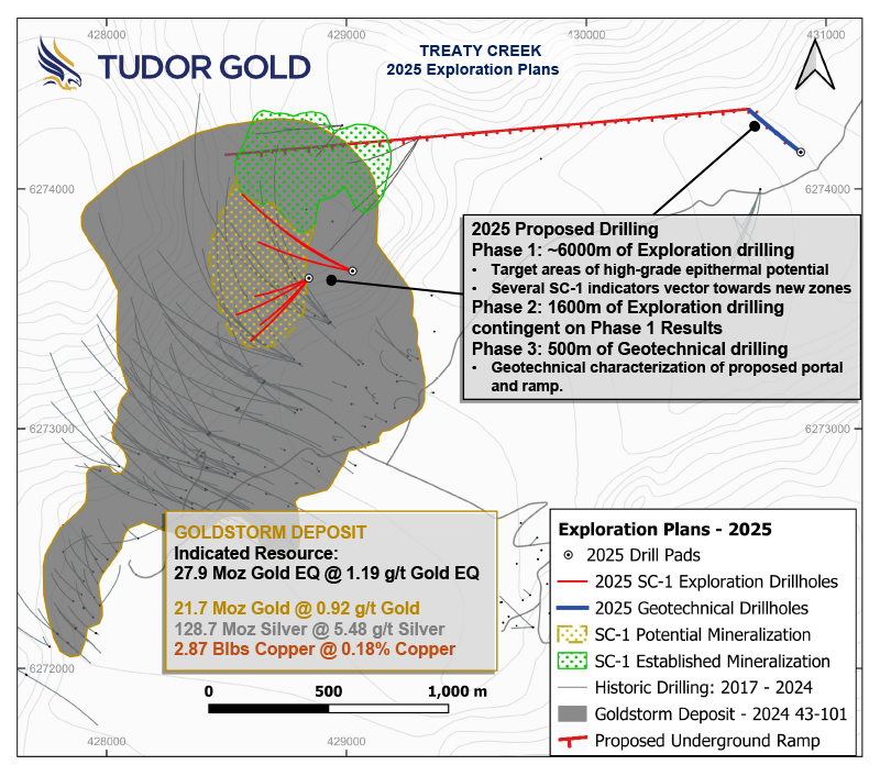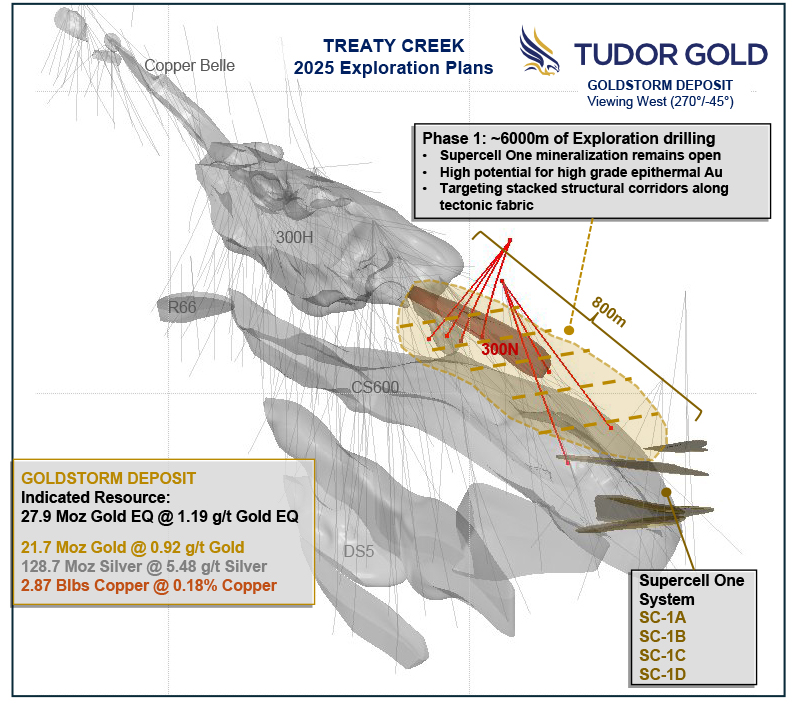 Ken Konkin, Senior Vice-President of Exploration for Tudor Gold, comments:“We are focused on increasing the high-grade gold potential of SC-1 with this year’s drill program. The planned holes are designed to expand upon the successful intercepts from our recent drill campaigns. The targets are structurally controlled, late-stage, gold-rich breccia systems that complement the four known SC-1 structures: SC-1 A, B, C and D. We look forward to a successful 2025 exploration program in the following months as we begin our quest to develop a multi-million-ounce high-grade gold system peripheral to the gold-copper Goldstorm Deposit.”