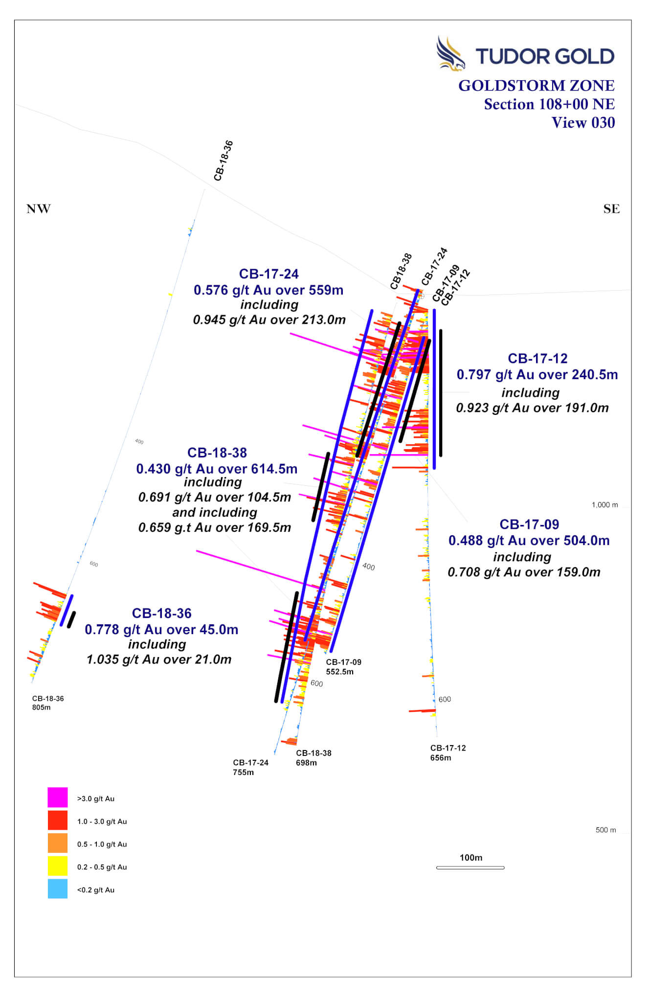The following table gives gold composite values over broad intervals from four drill hole sections that cut the Goldstorm Zone, incorporating results from diamond drill holes completed during 2016, 2017 and 2018. Low-grade gold mineralization occurs as a broad envelope which contains a horizon of stronger gold mineralization in the upper portion of the system. Furthermore, the drill hole sections demonstrate what appears to be the presence of a second, lower gold horizon. The corresponding sections 108+00 NE, 109+00 NE, 110+00 NE and 111+00 NE are displayed at the end of this news release.