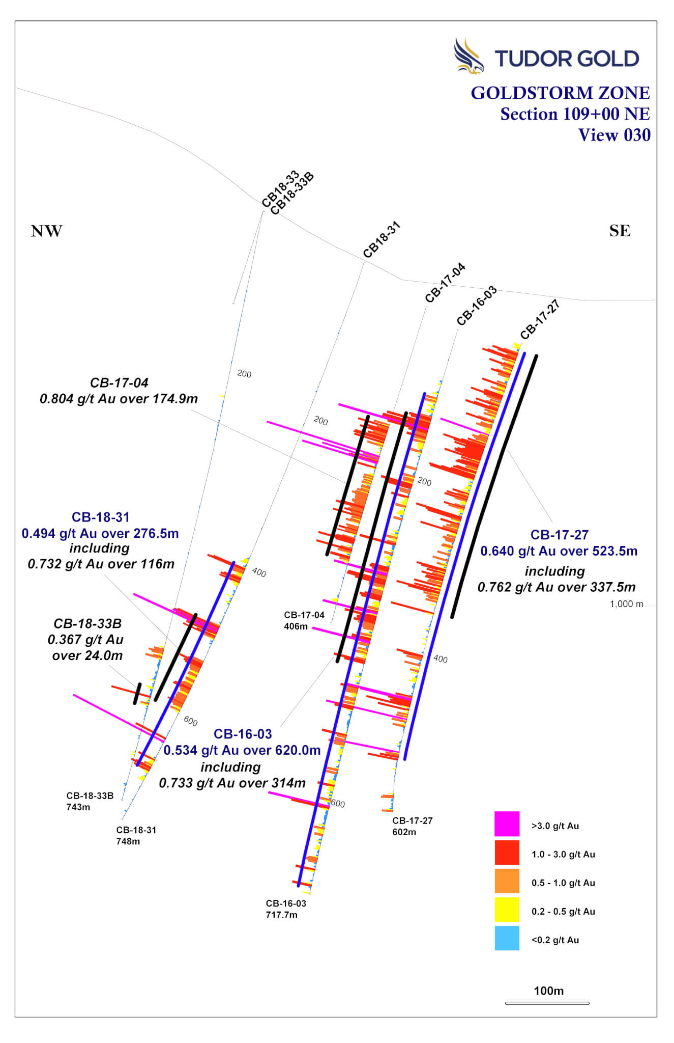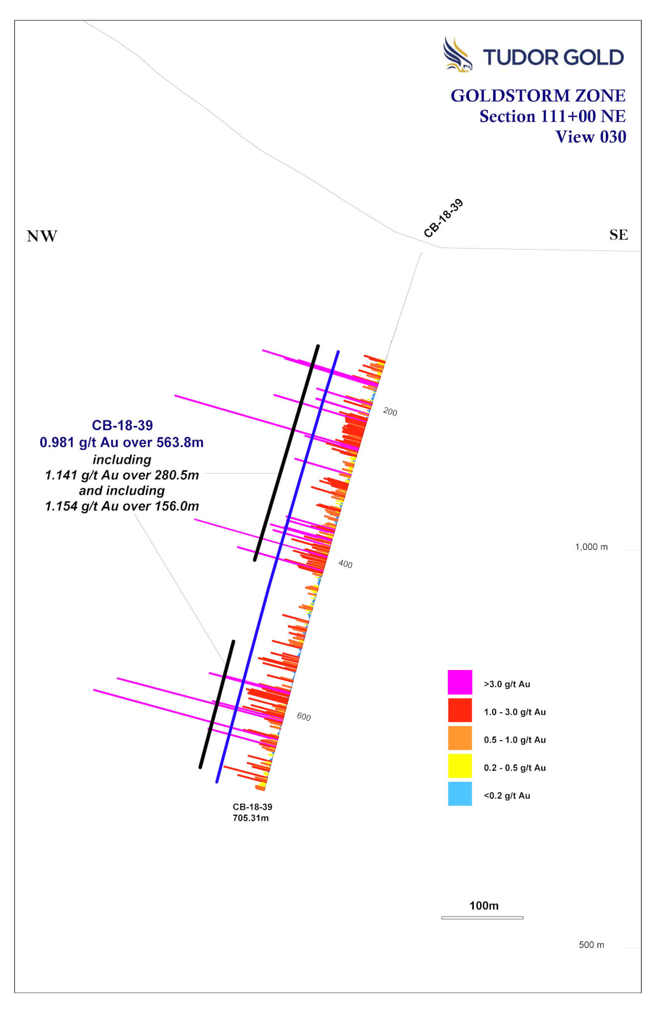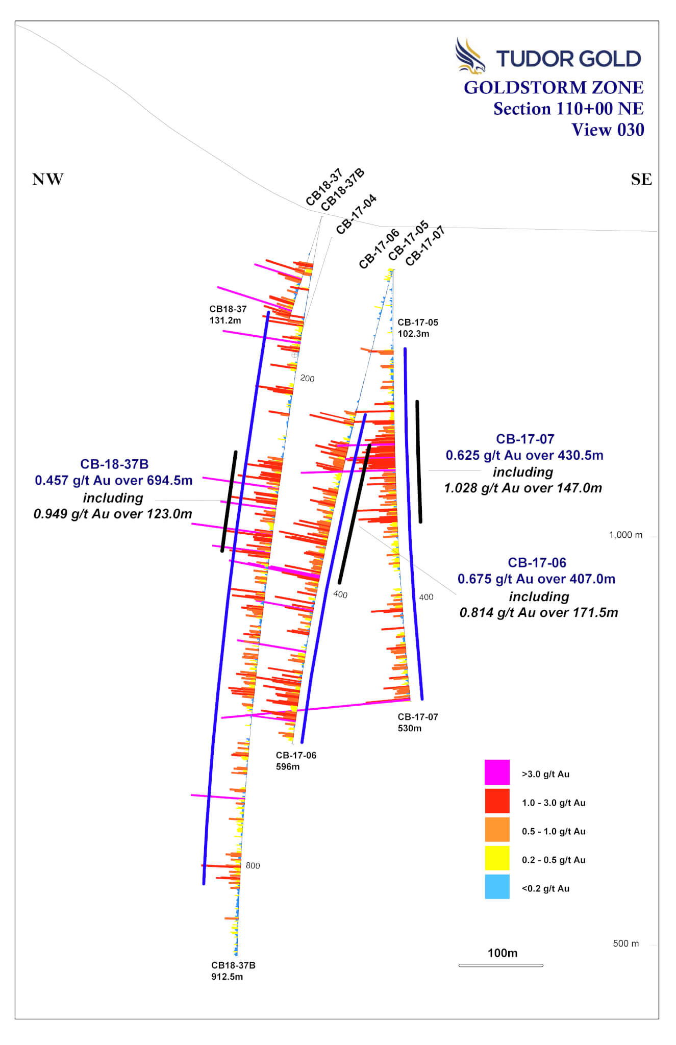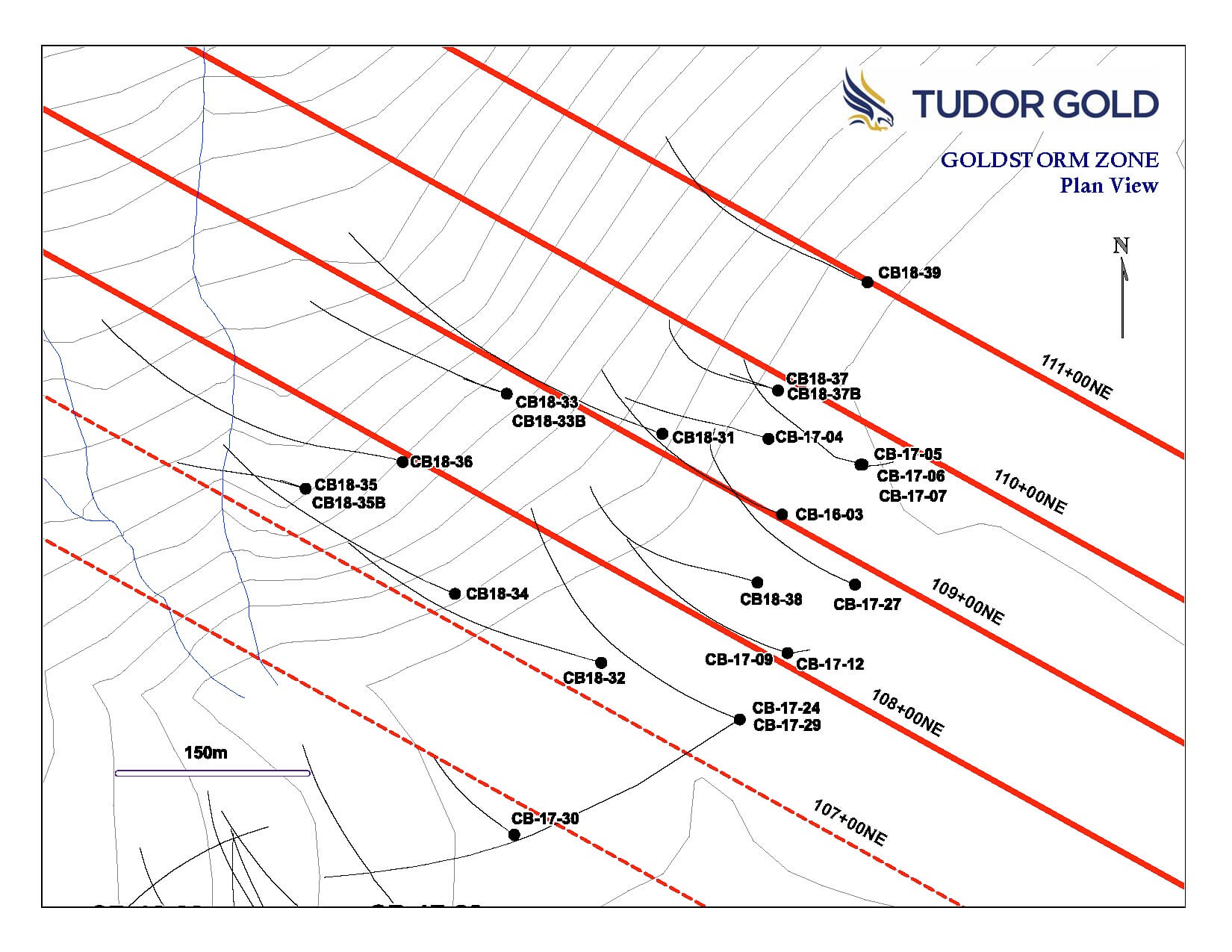 TUDOR GOLD Exploration Manager, Ken Konkin explains: “Goldstorm is a much larger system than Copper Belle, it is at least 300m wide and extends vertically for over 700m. The zone has been traced for approximately 500 meters along a northeastern azimuth. Gold mineralization appears to be continuing towards the northeast and southeast and clearly becomes stronger in the northernmost hole, CB18-39 which returned 563.8 meters of 0.981 grams per tonne gold. The upper portion of CB18-39 averaged 1.141 gpt gold over 280.5 meters and a lower zone in the same hole averaged 1.154 grams per tonne gold over 156 meters. This hole bottomed in mineralization and we will look at the option of re-entering the hole this year in attempts to extend the mineralization deeper. But the primary focus will be to extend the Goldstorm Zone along strike to the northeast and to the southeast as well.