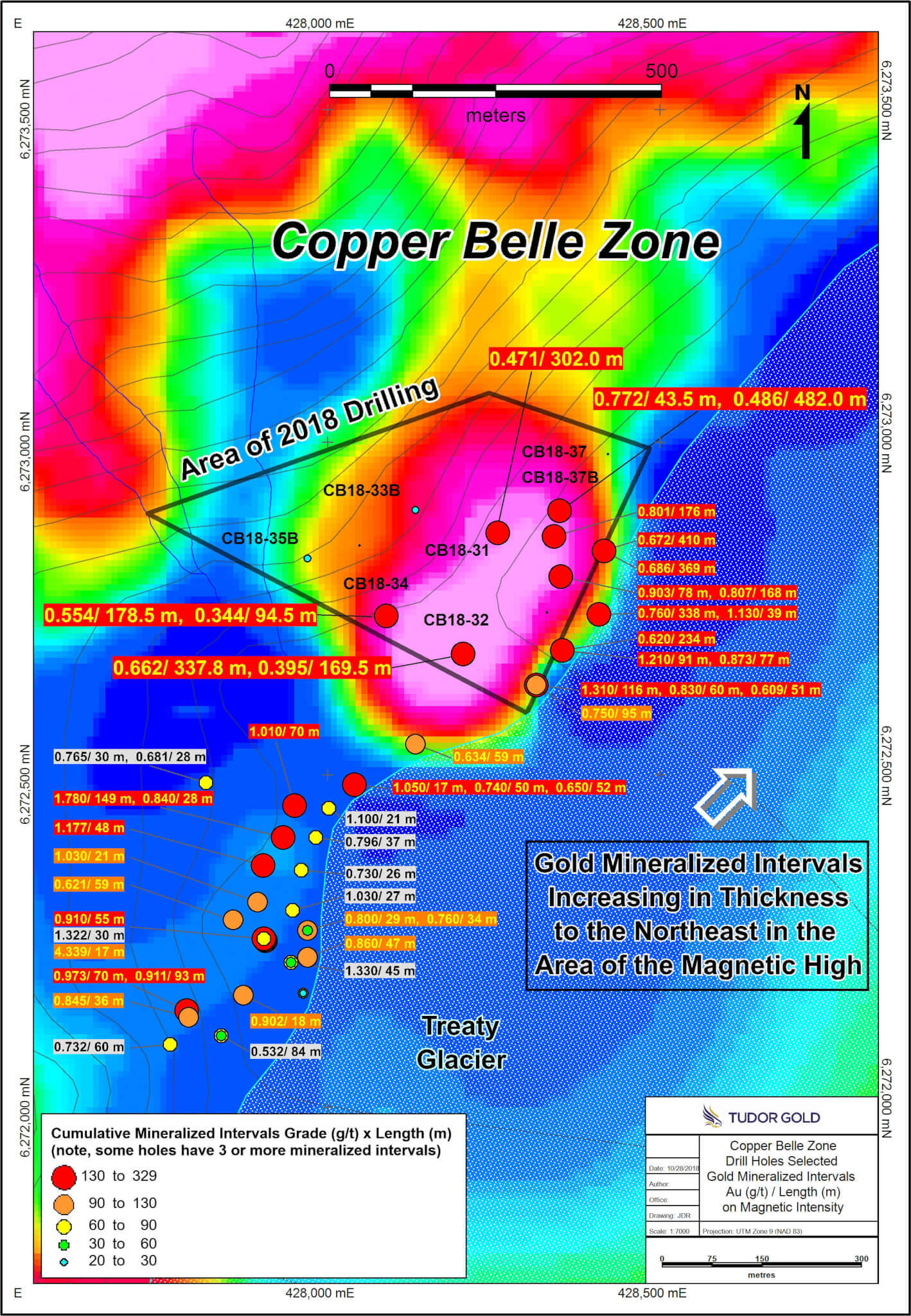 TUDOR GOLD Corp. (TSXV: TUD) (FSE: TUC) (the “Company” or “TUDOR GOLD”) is pleased to report results from four holes of the nine-hole 2018 drill program on the Copper Belle zone of the Company’s Treaty Creek property, in the “Golden Triangle” area of north-western BC.