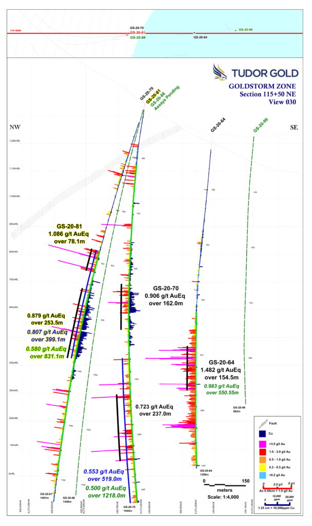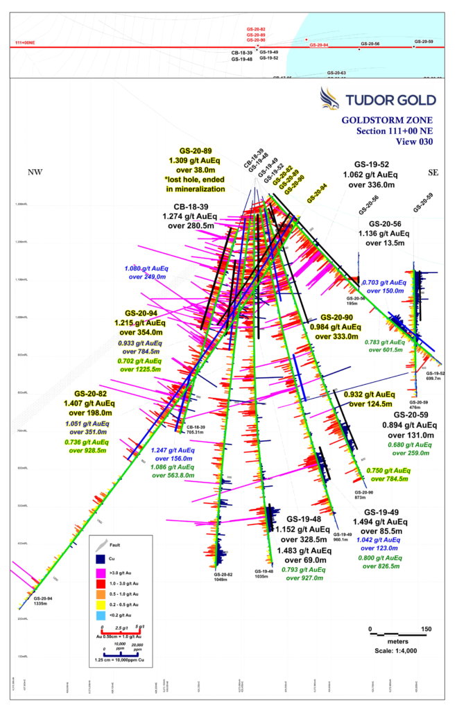 TUDOR GOLD’s Vice President of Project Development, Ken Konkin, P.Geo., states: “We are very pleased with the results obtained from all 39 drill holes completed this year to-date and we anticipate the release of the final 11 holes of the year within a few weeks. This brings the total to 50 drill holes that were completed this year at the Goldstorm Zone. These latest holes continued to expand the limits of the mineralized targets along the northeastern and the southeastern axes, and to depth. For a fifth consecutive press release, we have surpassed our best result from last years’ drill hole program (0.697 AuEq over 1081.5 meters in hole GS-19-47) with drill holes GS-20-83 and GS-20-94 as described in the headline. The final 11 drill holes represent over 9600 meters of drilling and we expect that MSA Labs will complete the analysis of these final samples as soon as possible.”