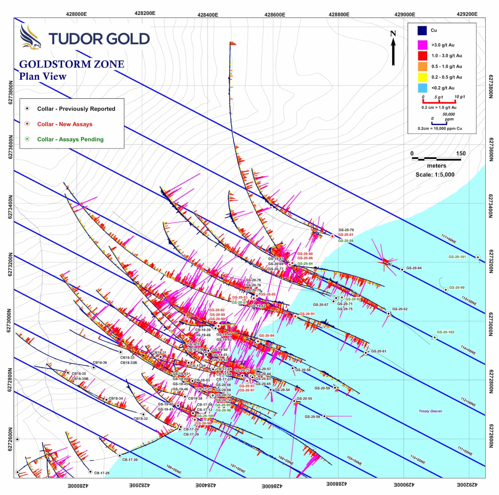 TUDOR GOLD Corp. (TSXV: TUD) (Frankfurt: TUC) (the “Company” or “TUDOR GOLD”) is pleased to present results for the fifth set of diamond drill holes for the Goldstorm Zone at their flagship property, Treaty Creek. The project is located in the heart of the Golden Triangle of northwestern British Columbia and is on-trend from Seabridge’s KSM Project located five kilometers southwest of the Goldstorm Zone. Results from 12 diamond drill holes have recently been received from MSA Labs with final results from another 11 diamond drill holes pending. All drill holes have successfully intersected the Goldstorm System, expanding and defining the mineralization along the northeast and southeast axes, as well as to depth. The Goldstorm System 300 Horizon has now been traced for 1100 meters along the northeast axis and, as well, the CS-600 and DS-5 zones have been expanded to the northeast and to depth. All 39 drill holes completed at Goldstorm during the 2020 program have encountered significant precious metal mineralization. The 2020 Treaty Creek Diamond Drill Program was completed last week, and field personnel have winterized the camp. The track-components of two track-mounted diamond drills remain on site ready for start-up of the 2021 exploration season.