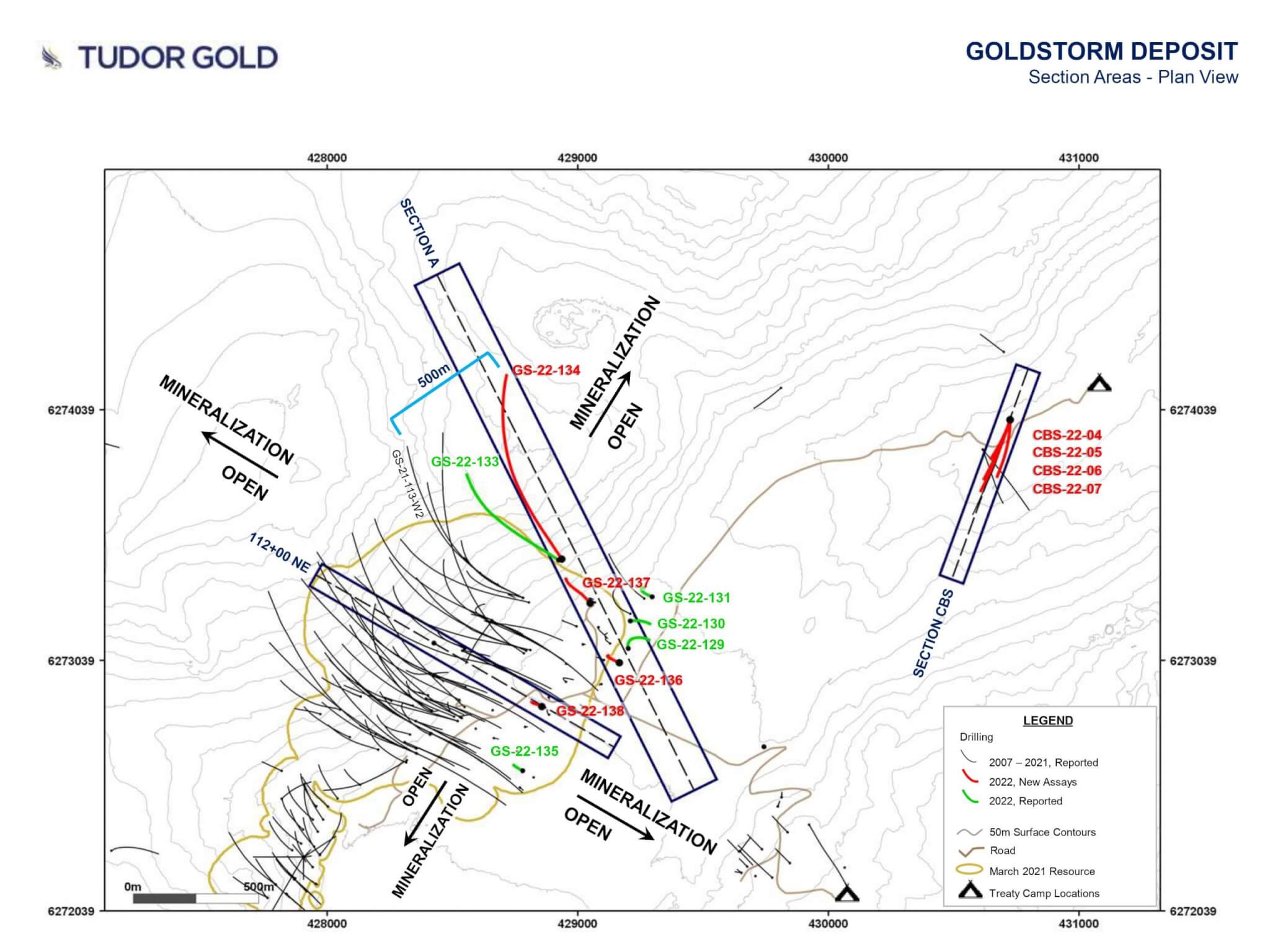 The Program at the Treaty Creek property includes an aggressive resource expansion and delineation plan on several areas including the Goldstorm Deposit and the Eureka and Calm Before the Storm zones. Results included in this press release are reported from eight diamond drill holes; four that were drilled on the Goldstorm Deposit from sections 112+00 and A, and four that were drilled on the Calm Before the Storm Zone (CBS). Seven out of eight holes were targeted outside the 2021 Mineral Resource Estimate area (see link: corresponding Treaty Creek plan map and sections).