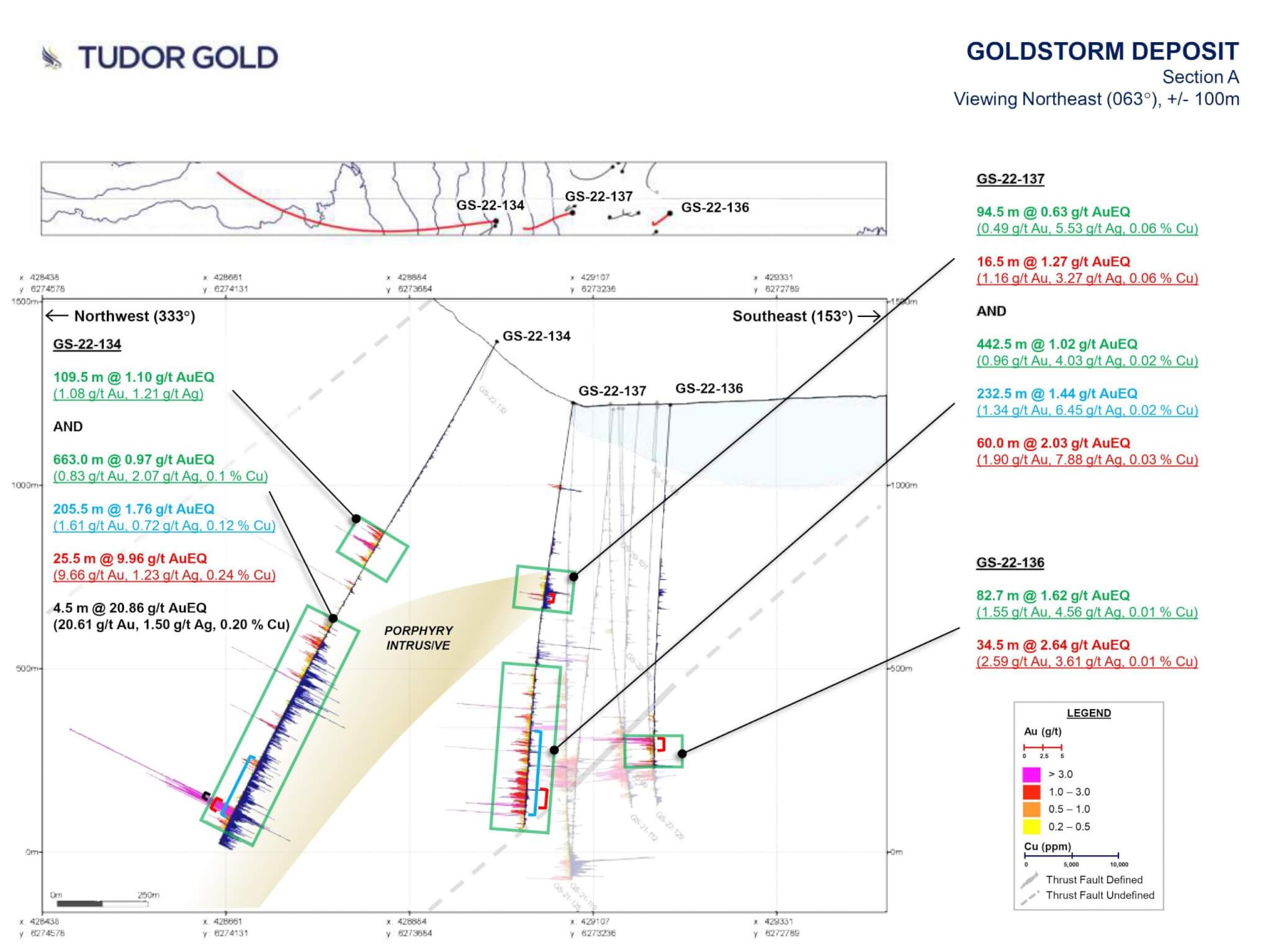 - GS-22-136 stepped out on the DS5 resource area and returned 34.5 m of 2.64 g/t AuEQ within 82.7 m of 1.62 g/t AuEQ. GS-22-136 stepped out 80 m from the 2021 drilling and tested the continuity of mineralization proximal to the Treaty Thrust Fault 2 (TTF2).