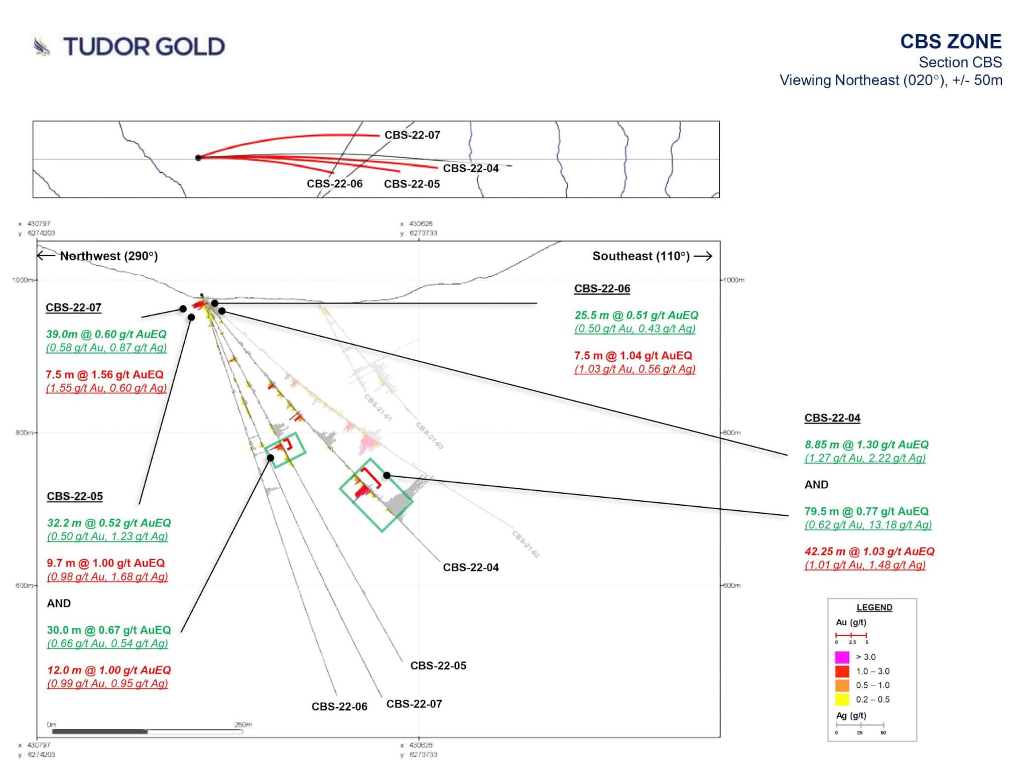 - CBS-22-06 confirmed the near surface mineralization with an intersection of 7.5 m of 1.04 g/t AuEQ.