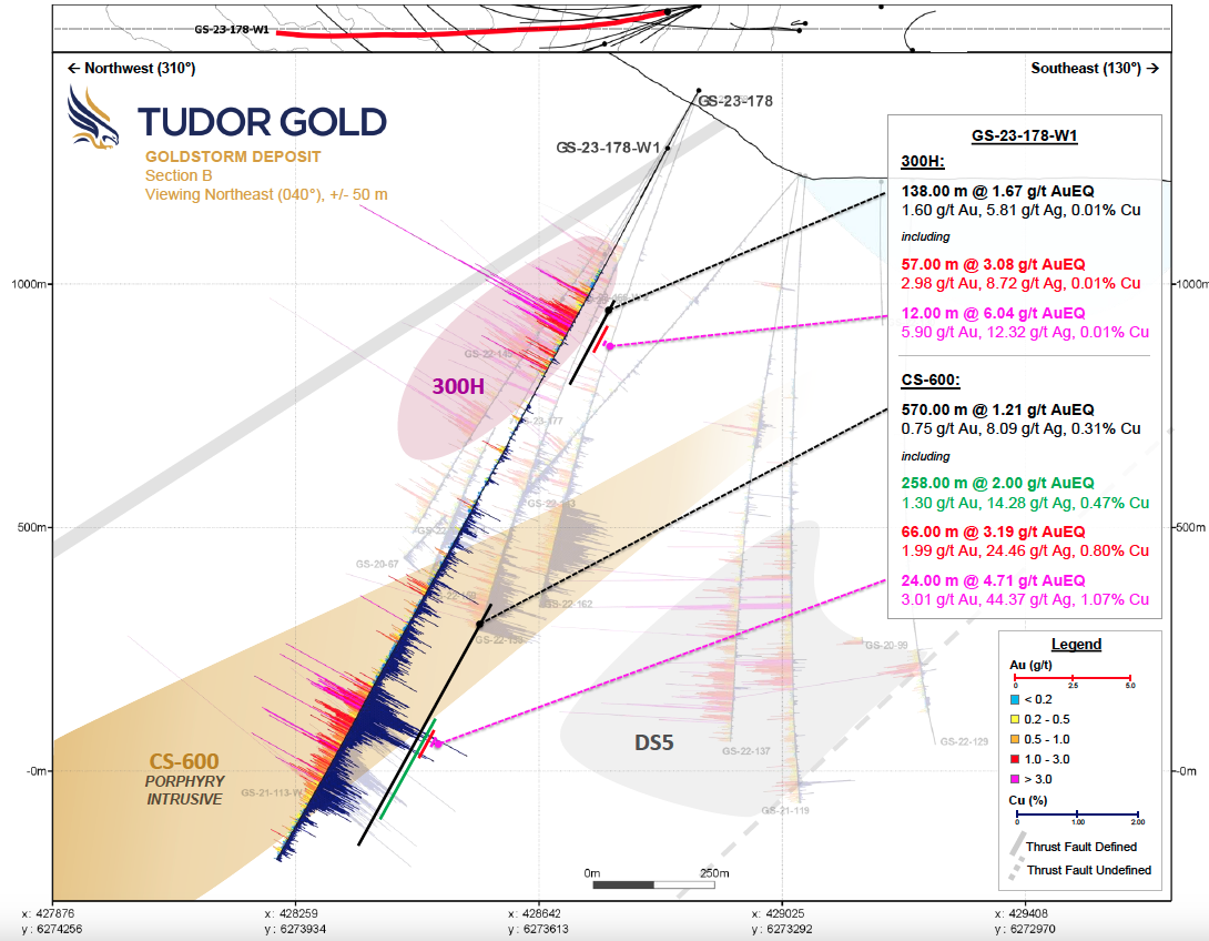 - GS-23-178-W1: Was drilled to target the CS-600 domain where the current Mineral Resource Estimate is categorized as Inferred mineral resources. The hole first intersected the 300H domain with 138.0 m grading 1.67 g/t AuEQ (1.60 g/t Au, 5.81 g/t Ag, 0.01 % Cu) and then successfully intersected the CS-600 domain with an overall interval of 570.0 m grading 1.21 g/t AuEQ (0.75 g/t Au, 8.09 g/t Ag, 0.31 % Cu) including 258.0 m grading 2.00 g/t AuEQ (1.30 g/t Au, 14.28 g/t Ag, 0.47 % Cu) and 66.0 m grading 3.19 g/t AuEQ (1.99 g/t Au, 24.46 g/t Ag, 0.80 % Cu).