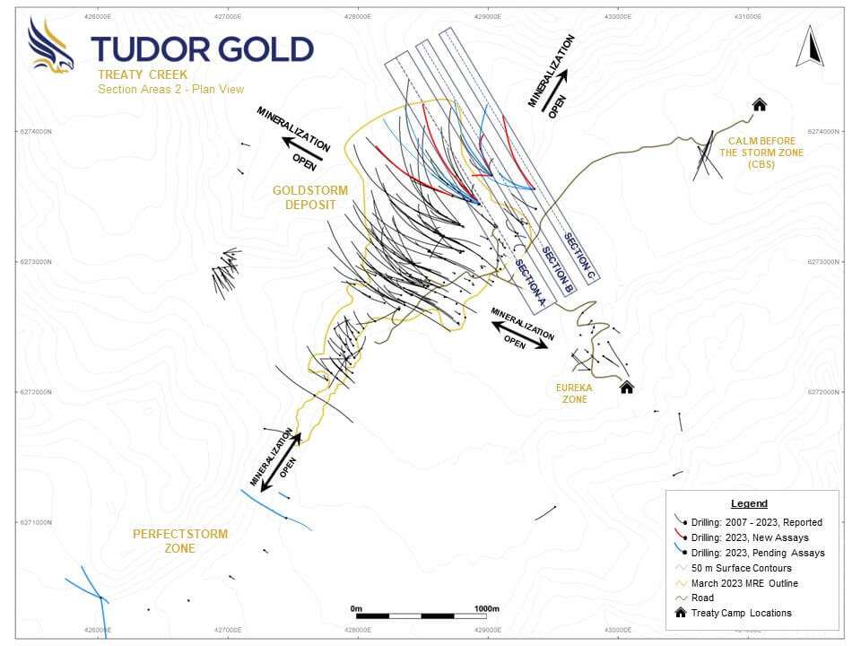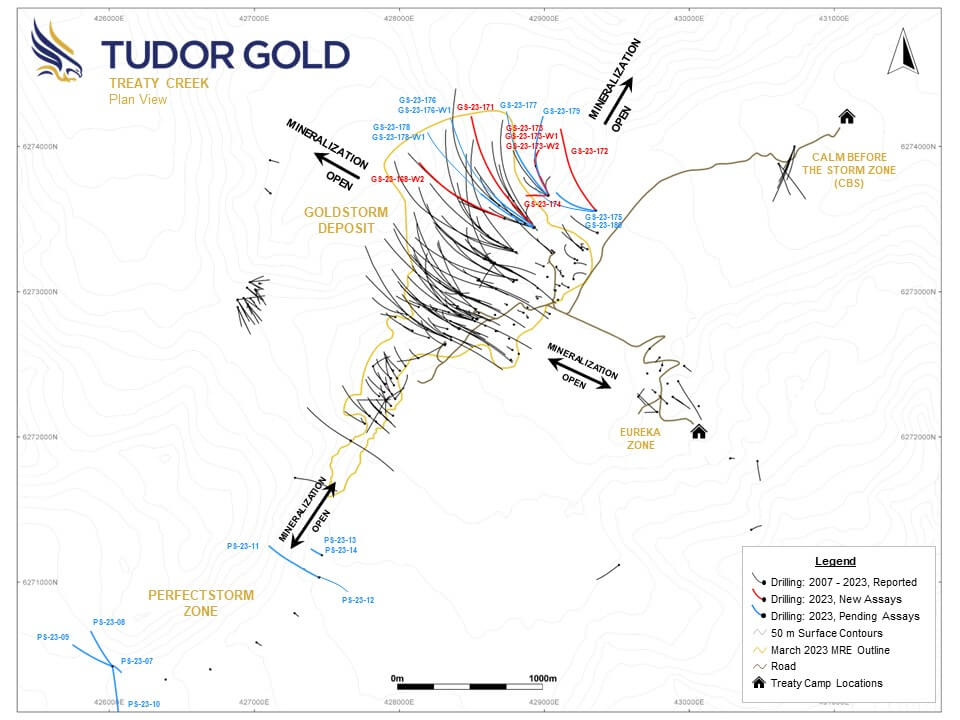 Based on our geological observations from the latest drilling, we have constructed two more drill pads ready for the 2024 season that are located approximately 500 m northeast of the current Mineral Resource limit. From these two super-pads, we should be able to complete drilling on the northern aspect of the deposit. Currently the deposit is open in all directions and at depth. Once the final definition drilling of the Goldstorm Deposit is completed, we can then focus our exploration on three other very promising targets; Eureka, Calm Before the Storm (CBS), and Perfectstorm (PSZ), while we advance Goldstorm to the Preliminary Economic Assessment (PEA) phase of the project.”