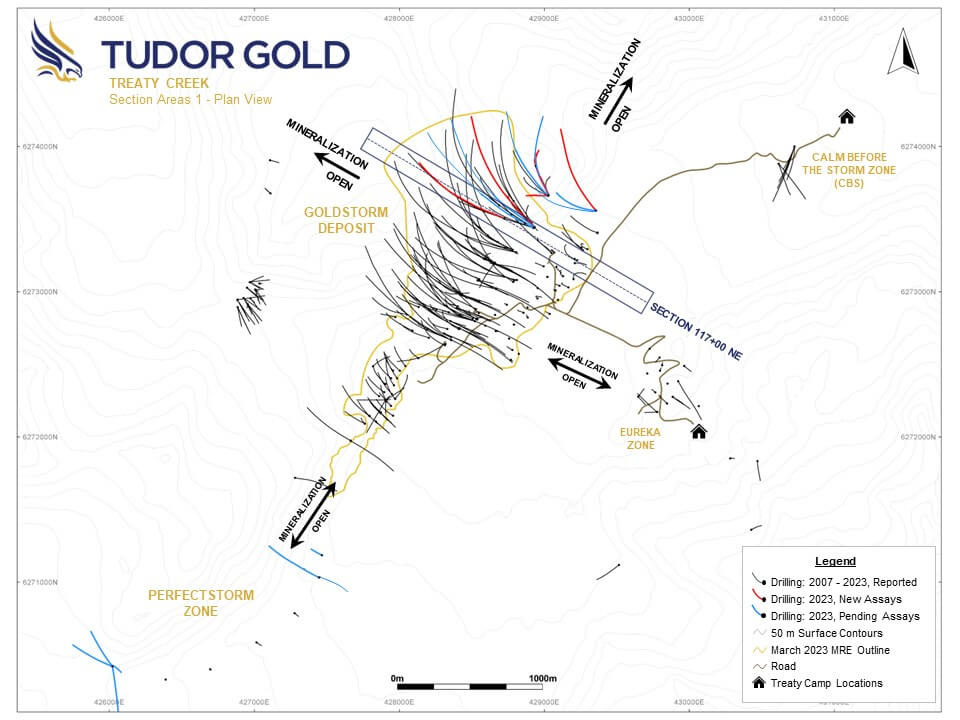 Ken Konkin, President and CEO, comments: “Once again we have been rewarded from our bold step-out drilling on the Goldstorm Deposit. These recent intercepts, outside the limits used for the April 28, 2023 Mineral Resource, continue to expand the size of the deposit and, at the same time, infill drilling has successfully defined large blocks containing strong gold, silver and copper mineralization within drill inferred areas. Our objective is to continue to explore the deposit limits to the northwest, north and northeast, thereby increasing the volume of the Mineral Resource while maintaining the higher gold, silver and copper grades of our most recent Mineral Resource Estimate. Our fundamental priority for continued exploration will be to define the limits of the known domains that comprise the Goldstorm Deposit and to upgrade areas of Inferred Resources to the Indicated category.