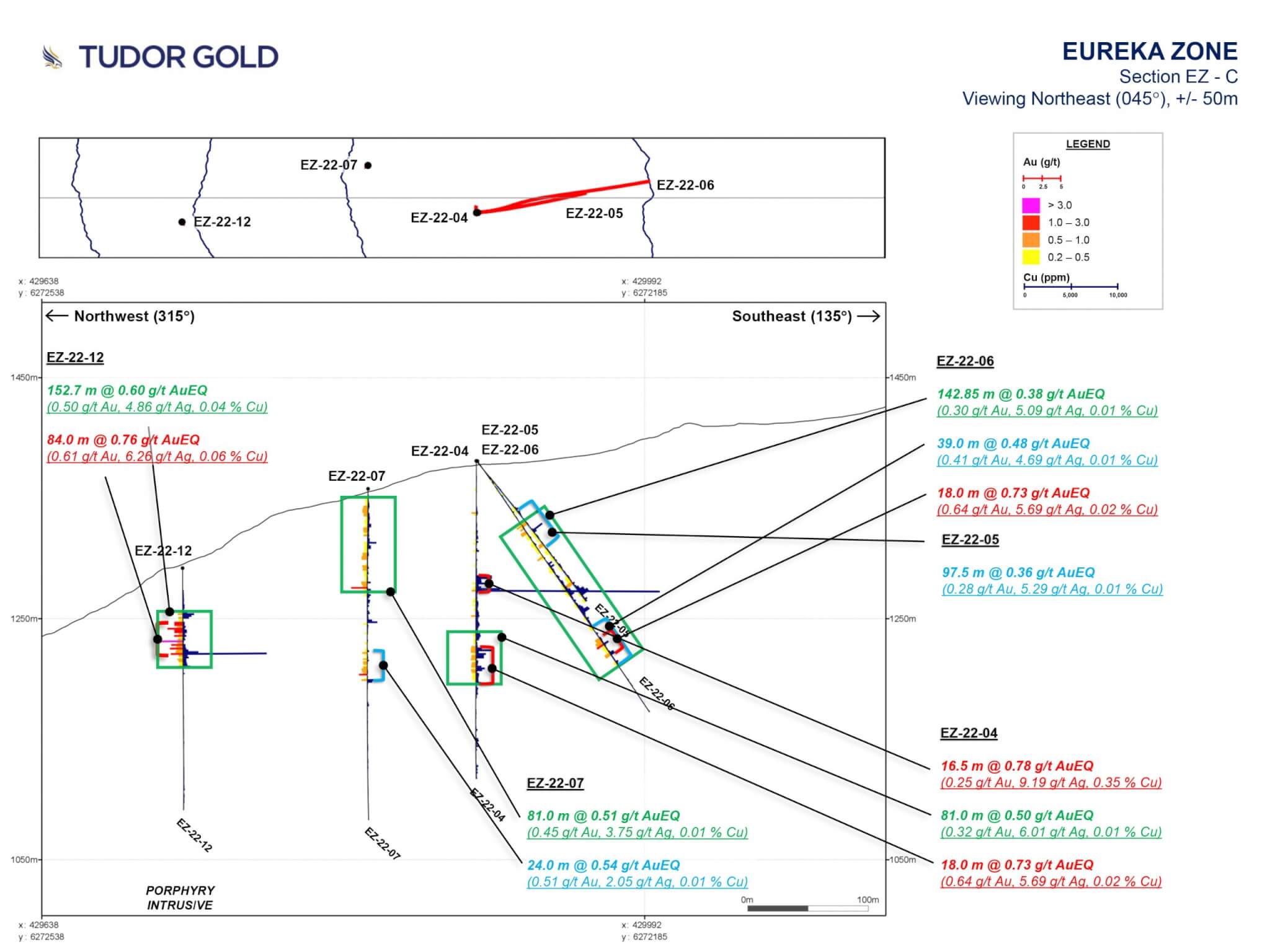 - EZ-22-10: 0.54 g/t AuEQ (0.43 g/t Au, 5.43 g/t Ag, 0.04 % Cu) over 135.0 m.