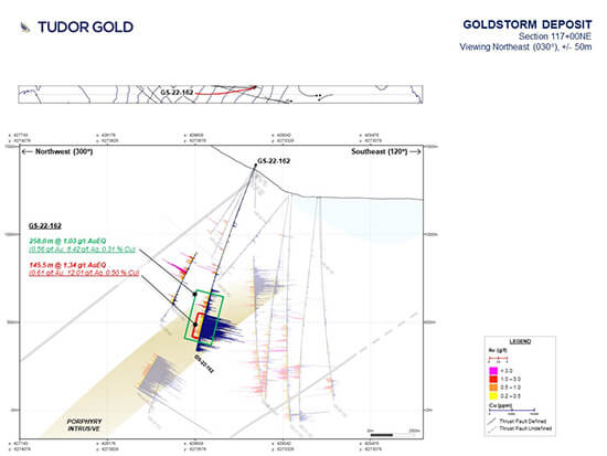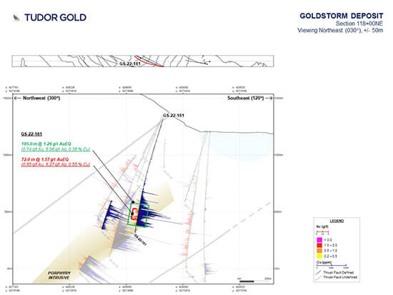 Ken Konkin, President and CEO, comments: “We are very pleased to announce results from the Treaty Creek exploration campaign with the release of five drill holes completed on our Goldstorm Deposit. The best result was from the northern step-out area well outside the estimated resource area with hole GS-22-159. The CS600 domain contained 1.71 g/t AuEQ over 180 meters (m) with 0.92 g/t Au, 6.10 g/t Ag and 0.61 % Cu. This drill hole ended in strong copper mineralization and this composite was centred on a much larger composite of 489.0 m averaging 1.12 g/t AuEQ (0.66 g/t Au, 3.60 g/t Ag, 0.36 % Cu). Ground conditions prevented the completion of this drill hole. Also of significance, silver grades we elevated within several holes of the newly discovered northern extension of the CS600 domain. Drill hole GS-22-162 intersected 1.34 g/t AuEQ over 145.5 m with 0.61 g/t Au, 12.01 g/t Ag and 0.5 % Cu. In addition to expanding the deposit to the north, we were successful in confirming the near-surface, southeasterly expansion of the newly discovered Route 66 Zone that yielded 0.95 g/t AuEQ over 42.0 m. We continue to observe higher gold, silver and copper grades throughout the northern step-out expansion of the Goldstorm Deposit than the grades derived from the 2021 Initial Resource Estimate. Despite significantly expanding the resource limits of the Goldstorm Deposit, it remains open in all directions and at depth. Our geologists will focus their attention on refining the geological model and completing an updated Goldstorm resource for 2023. In addition, numerous samples were collected for on-going petrographic, mineralogical and metallurgical studies that will be carried out during the following winter months.
