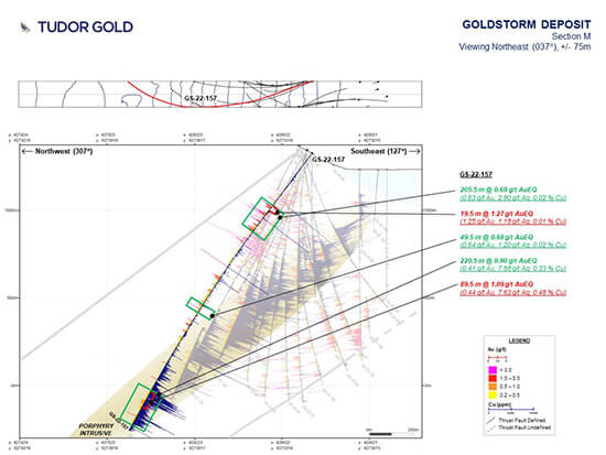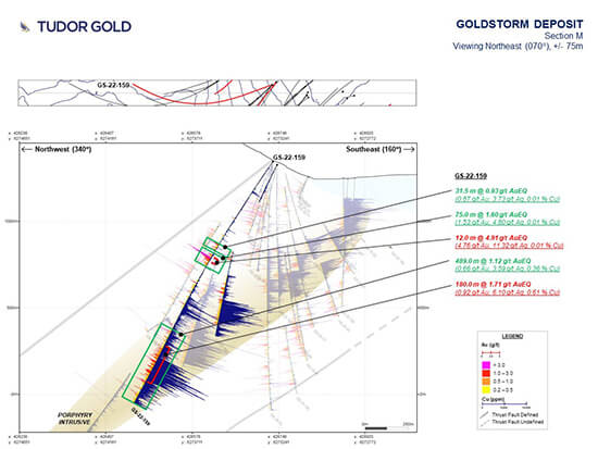 - GS-22-159 was drilled to determine the deep extension of mineralization along CS600, north of GS-21-113-W2. A drill length intercept of 489.0 m of 1.12 g/t AuEQ (0.66 g/t Au, 3.60 g/t Ag, 0.36 % Cu) as well as an enriched zone of 180.0 m of 1.71 g/t AuEQ (0.92 g/t Au, 6.10 g/t Ag, 0.61 % Cu) strongly demonstrates the continuity of gold-copper porphyry intrusive system at depth and to the north. This hole ended in mineralization.